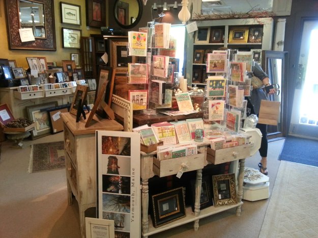 Wonderful attractive displays of gifts, note cards, candles and prints at The Village Framers in Yarmouth, Maine.